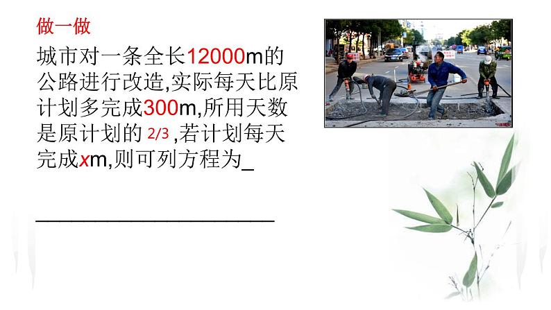 城市对一条全长12000m的公路进行改造,实际每天比原计划多完成300m,所用天数是原计划的 ,若计划每天完成xm,则可列方程为_____________________