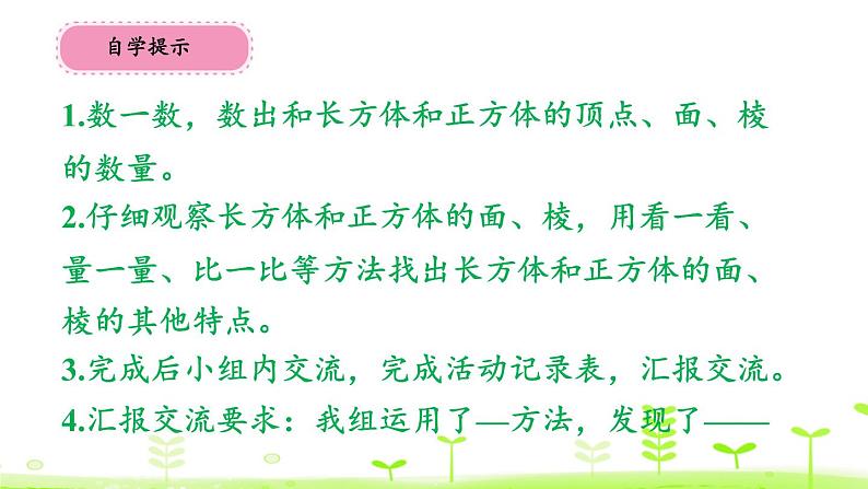 展开1.数一数,数出和长方体和正方体的顶点、面、棱的数量。2.仔细观察长方体和正方体的面、棱,用看一看、量一量、比一比等方法找出长方体和正方体的面、棱的其他特点。3.完成后小组内交流,完成活动记录表,汇报交流。4.汇报交流要求:我组运用了—方法,发现了——