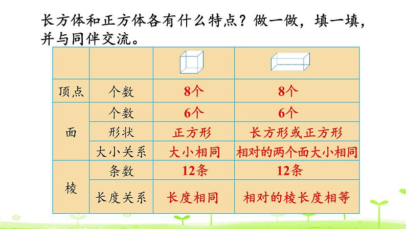 长方体和正方体各有什么特点?做一做,填一填, 并与同伴交流。