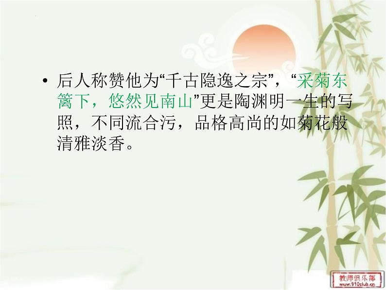后人称赞他为“千古隐逸之宗”,“采菊东篱下,悠然见南山”更是陶渊明一生的写照,不同流合污,品格高尚的如菊花般清雅淡香。