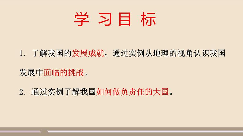 1. 了解我国的发展成就,通过实例从地理的视角认识我国发展中面临的挑战。2. 通过实例了解我国如何做负责任的大国。