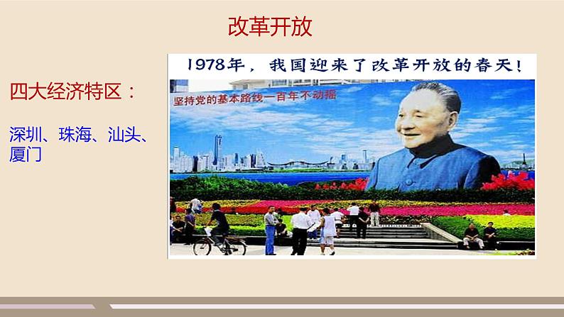 这是一份2021学年第十章 中国在世界中评课课件ppt,共29页。PPT课件主要包含了学习目标,改革开放,四大经济特区,发展中面临的挑战,面临的问题,人地关系不和谐,区域发展不平衡,东中西部发展极不平衡,应对措施,做负责任的大国等内容,欢迎下载使用。