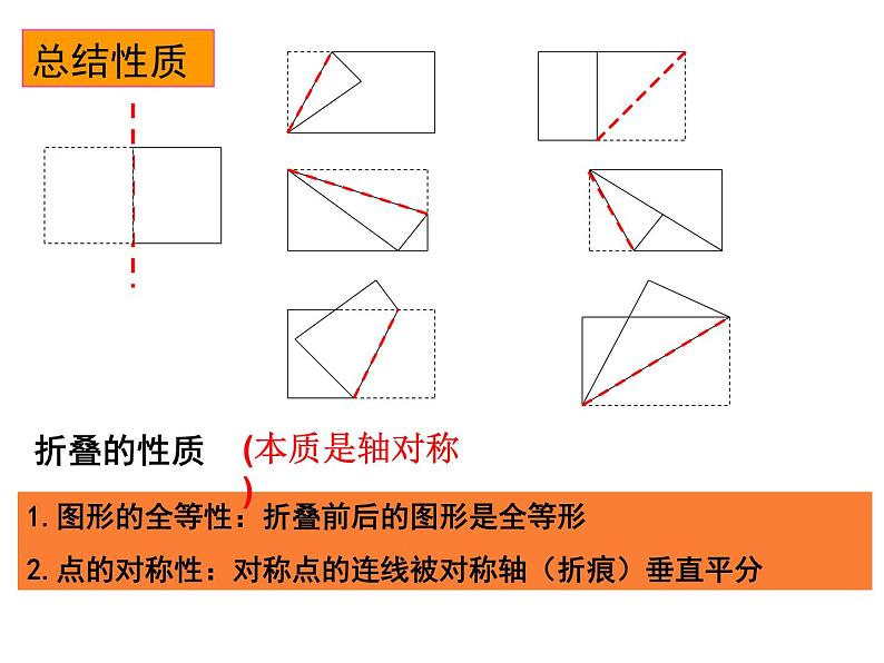 1.图形的全等性:折叠前后的图形是全等形2.点的对称性:对称点的连线被对称轴(折痕)垂直平分