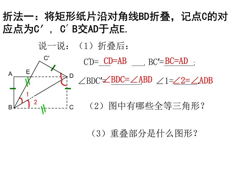 折法一:将矩形纸片沿对角线BD折叠,记点C的对应点为C′, C′B交AD于点E.