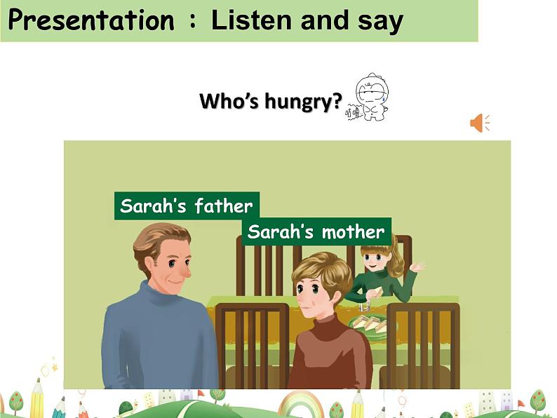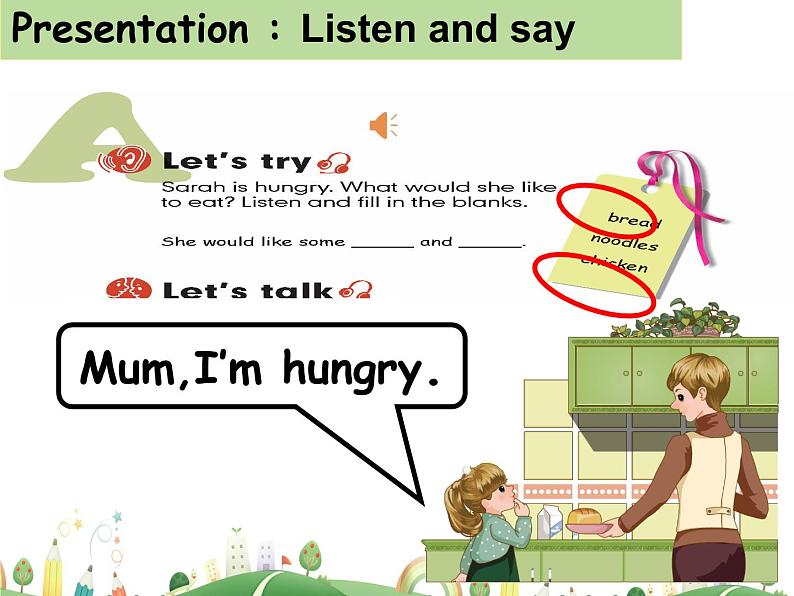 Sarah: Mum, I'm hungry.Sarah's mther: What wuld yu like t eat?Sarah: I'd like sme bread and chicken,please.Sarah's mther: Here yu are, dear. Have sme chicken sandwiches.Sarah: Thanks, mum.