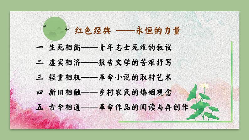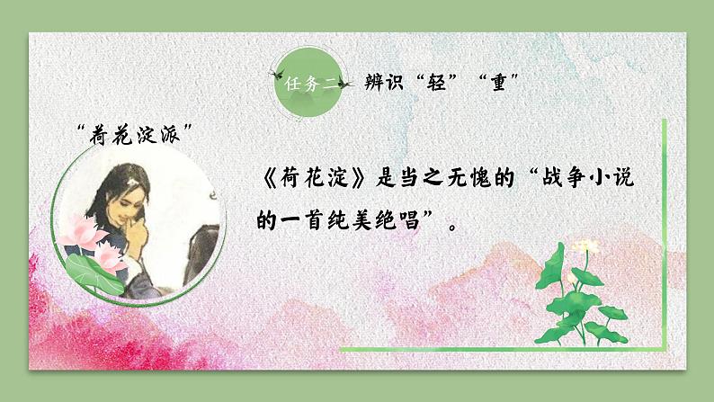 这是一份人教统编版选择性必修 中册8.1 荷花淀教学ppt课件,共15页。PPT课件主要包含了情境任务,“荷花淀派”,改写《老山界》,“轻”“重”练笔等内容,欢迎下载使用。