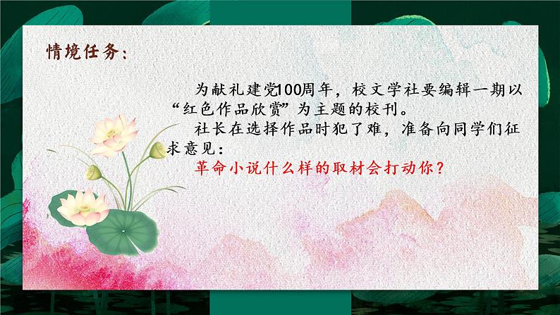 为献礼建党100周年,校文学社要编辑一期以“红色作品欣赏”为主题的校刊。 社长在选择作品时犯了难,准备向同学们征求意见: 革命小说什么样的取材会打动你?