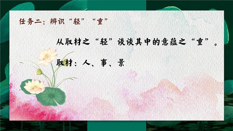 从取材之“轻”谈谈其中的意蕴之“重”。取材:人、事、景