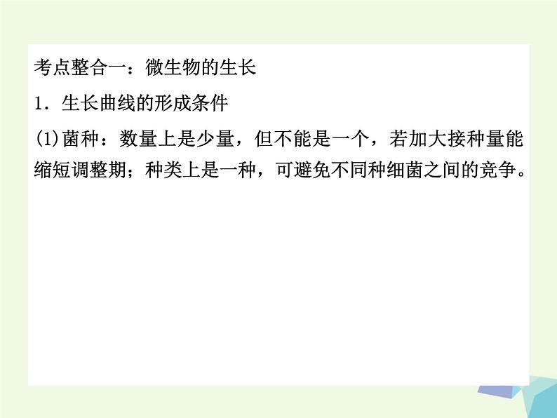 考点整合一:微生物的生长1.生长曲线的形成条件(1)菌种:数量上是少量,但不能是一个,若加大接种量能缩短调整期;种类上是一种,可避免不同种细菌之间的竞争。
