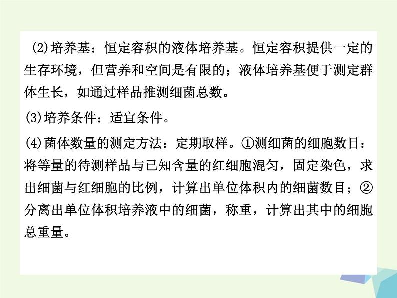 (2)培养基:恒定容积的液体培养基。恒定容积提供一定的生存环境,但营养和空间是有限的;液体培养基便于测定群体生长,如通过样品推测细菌总数。(3)培养条件:适宜条件。(4)菌体数量的测定方法:定期取样。①测细菌的细胞数目:将等量的待测样品与已知含量的红细胞混匀,固定染色,求出细菌与红细胞的比例,计算出单位体积内的细菌数目;②分离出单位体积培养液中的细菌,称重,计算出其中的细胞总重量。