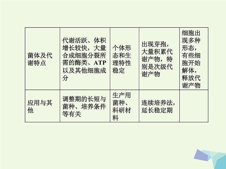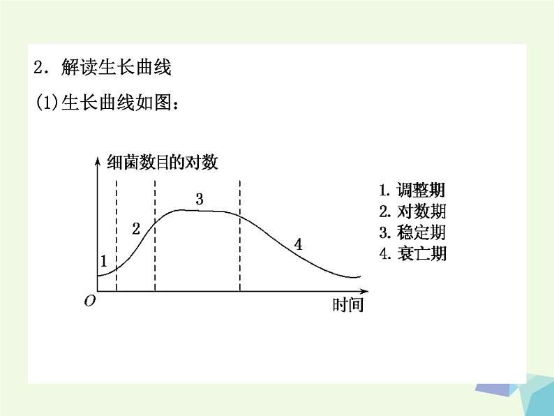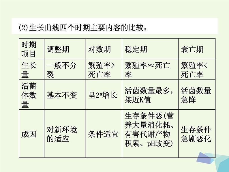 2.细菌的生长曲线与种群的增长曲线比较(1)细菌的生长曲线与种群的增长曲线均以时间为横坐标,但生长曲线纵坐标是细菌数目的对数,增长曲线纵坐标是种群数量。生长曲线可分为四个时期。