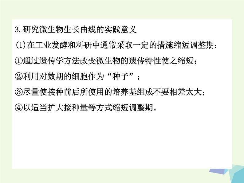 3.研究微生物生长曲线的实践意义(1)在工业发酵和科研中通常采取一定的措施缩短调整期:①通过遗传学方法改变微生物的遗传特性使之缩短;②利用对数期的细胞作为“种子”;③尽量使接种前后所使用的培养基组成不要相差太大;④以适当扩大接种量等方式缩短调整期。