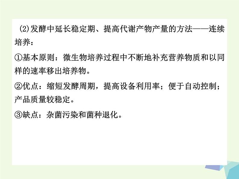 (2)发酵中延长稳定期、提高代谢产物产量的方法——连续培养:①基本原则:微生物培养过程中不断地补充营养物质和以同样的速率移出培养物。②优点:缩短发酵周期,提高设备利用率;便于自动控制;产品质量较稳定。③缺点:杂菌污染和菌种退化。