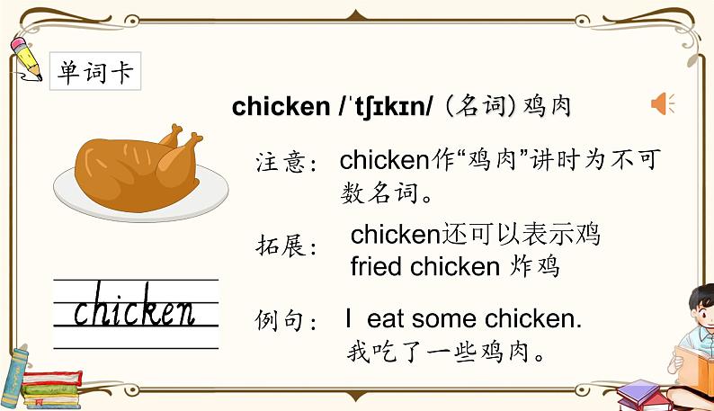 chicken /ˈtʃɪkɪn/ (名词)鸡肉