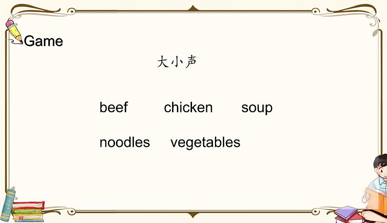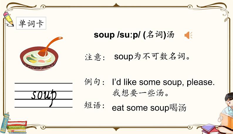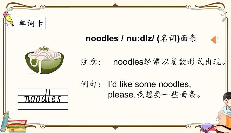 这是一份人教版 (PEP)四年级上册Unit 5 Dinner is ready Part A图文ppt课件,文件包含unit5partA2pptx、beefmp3、breadmp3、chickenmp3、fishmp3、juicemp3、milkmp3、noodlesmp3、ricemp3、soupmp3、vegetablemp3等11份课件配套教学资源,其中PPT共23页, 欢迎下载使用。