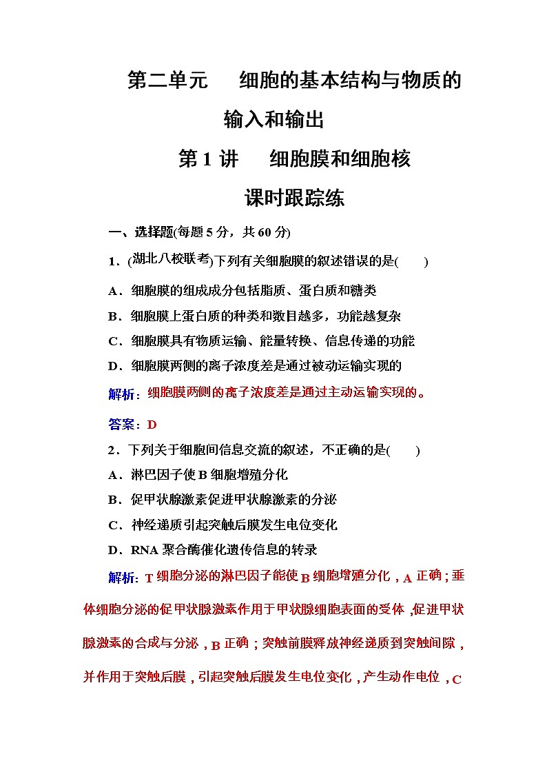 高考生物一轮复习练习:2.1课时跟踪练《细胞膜和细胞核》(含详解)