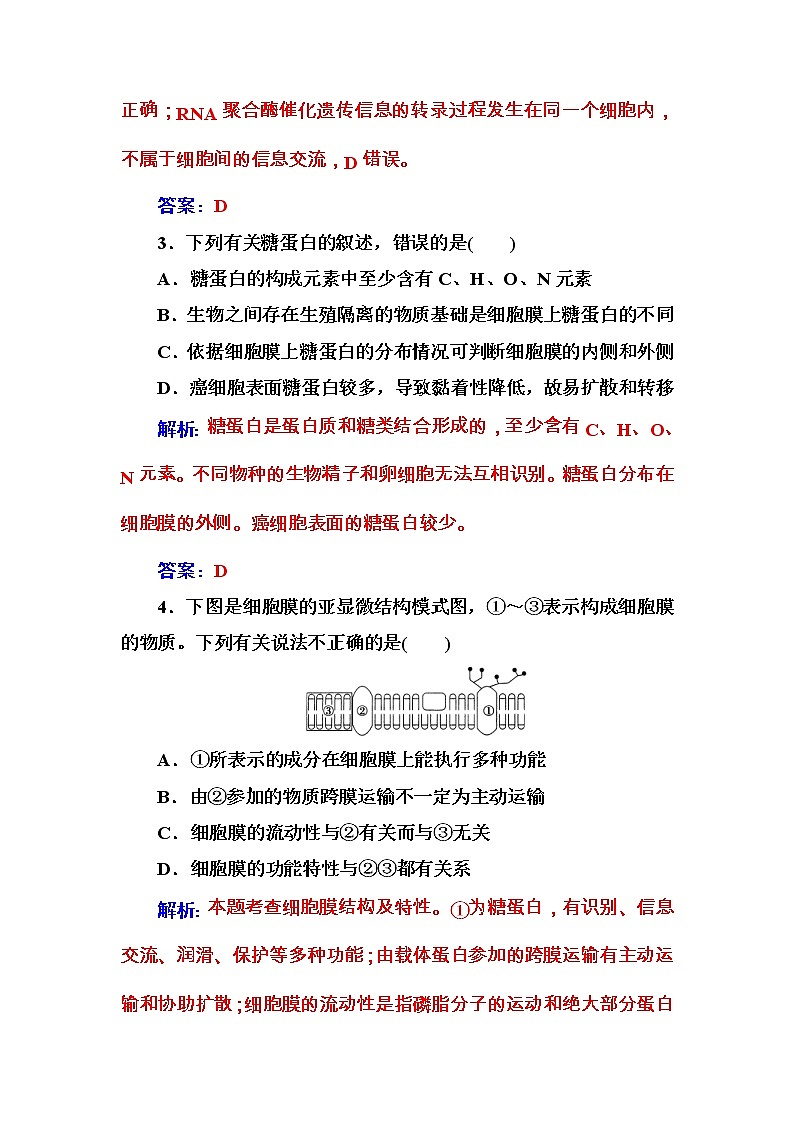 解析:本题考查细胞膜结构及特性。①为糖蛋白,有识别、信息交流、润滑、保护等多种功能;由载体蛋白参加的跨膜运输有主动运输和协助扩散;细胞膜的流动性是指磷脂分子的运动和绝大部分蛋白质的运动;细胞膜的选择透过性与磷脂双分子层和载体蛋白都有关。