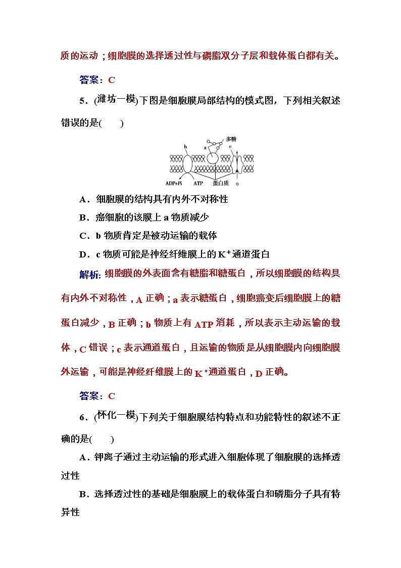 解析:细胞膜的外表面含有糖脂和糖蛋白,所以细胞膜的结构具有内外不对称性,A正确;a表示糖蛋白,细胞癌变后细胞膜上的糖蛋白减少,B正确;b物质上有ATP消耗,所以表示主动运输的载体,C错误;c表示通道蛋白,且运输的物质是从细胞膜内向细胞膜外运输,可能是神经纤维膜上的K+通道蛋白,D正确。