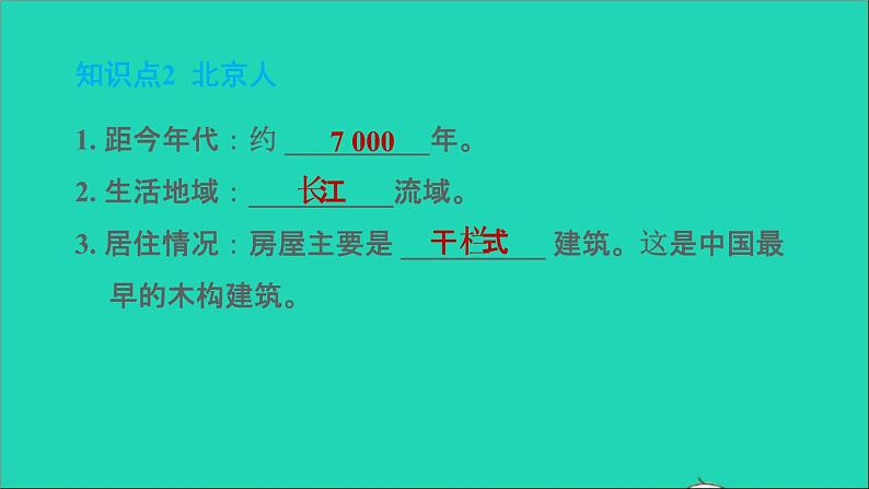 这是一份人教部编版七年级上册第二课 原始农耕生活习题ppt课件,共29页。PPT课件主要包含了磨制石器,知识点2北京人,干栏式,知识点3山顶洞人,半地穴,见习题,答案A,答案D等内容,欢迎下载使用。