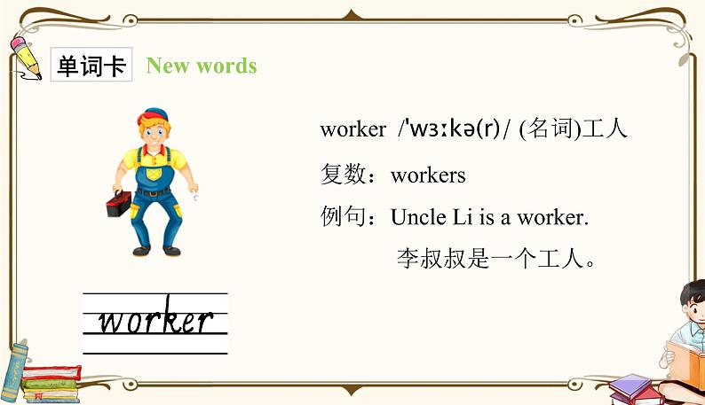 wrker /'wɜːkə(r)/ (名词)工人复数:wrkers例句:Uncle Li is a wrker. 李叔叔是一个工人。