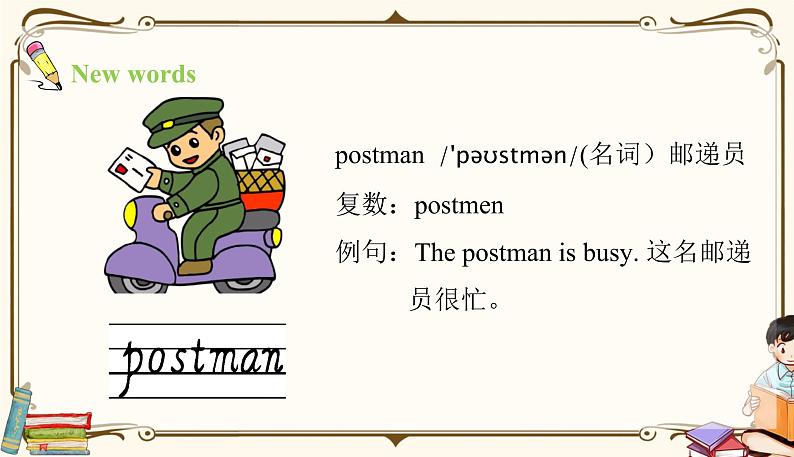 pstman /'pəʊstmən/(名词)邮递员复数:pstmen例句:The pstman is busy. 这名邮递 员很忙。