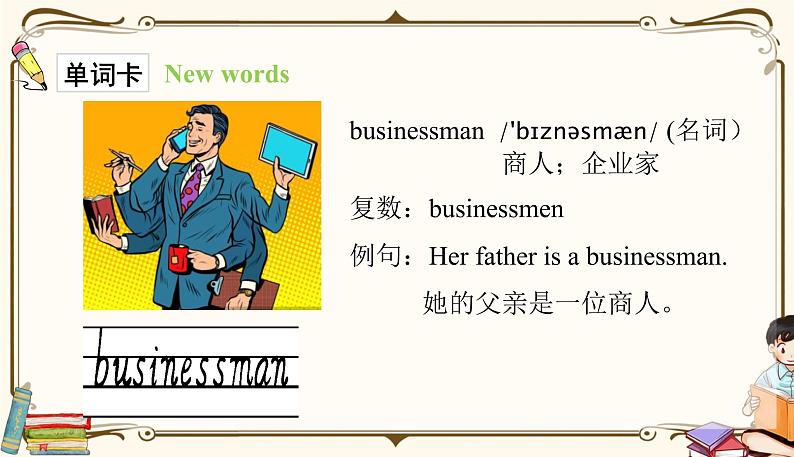 businessman /'bɪznəsmæn/ (名词) 商人;企业家复数:businessmen例句:Her father is a businessman. 她的父亲是一位商人。