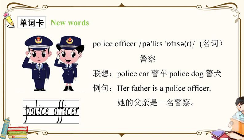 plice fficer /pə'liːs 'ɒfɪsə(r)/ (名词) 警察联想:plice car 警车 plice dg 警犬例句:Her father is a plice fficer. 她的父亲是一名警察。
