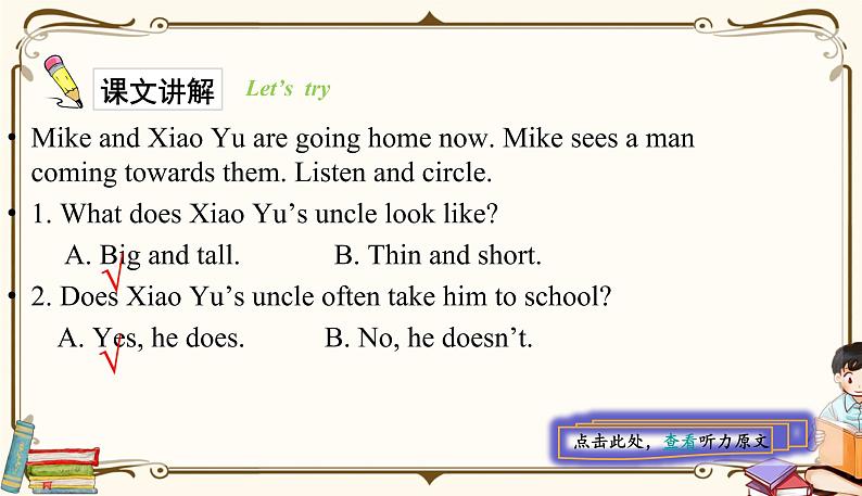 Mike and Xia Yu are ging hme nw. Mike sees a man cming twards them. Listen and circle.1. What des Xia Yu’s uncle lk like? A. Big and tall. B. Thin and shrt.2. Des Xia Yu’s uncle ften take him t schl? A. Yes, he des. B. N, he desn’t.