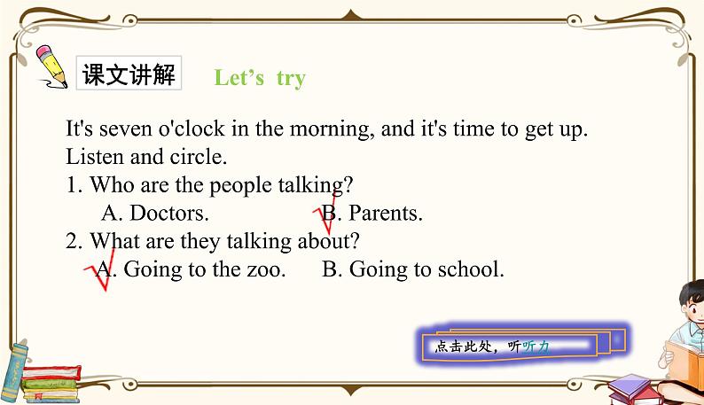 It's seven 'clck in the mrning, and it's time t get up. Listen and circle.1. Wh are the peple talking? A. Dctrs. B. Parents.2. What are they talking abut? A. Ging t the z. B. Ging t schl.