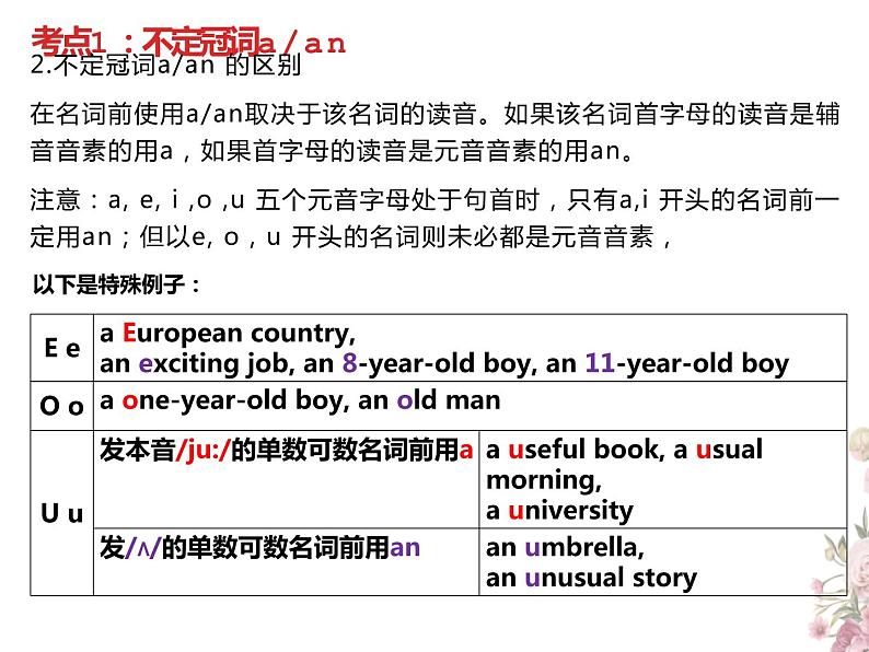 2.不定冠词a/an 的区别在名词前使用a/an取决于该名词的读音。如果该名词首字母的读音是辅音音素的用a,如果首字母的读音是元音音素的用an。注意:a, e, i , ,u 五个元音字母处于句首时,只有a,i 开头的名词前一定用an;但以e, , u 开头的名词则未必都是元音音素,