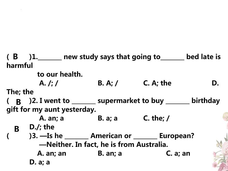 ()1.________ new study says that ging t________ bed late is harmful t ur health. A. /; /B. A; /C. A; theD. The; the()2. I went t ________ supermarket t buy ________ birthday gift fr my aunt yesterday. A. an; aB. a; aC. the; /D./; the()3. —Is he ________ American r ________ Eurpean? —Neither. In fact, he is frm Australia. A. an; anB. an; aC. a; anD. a; a