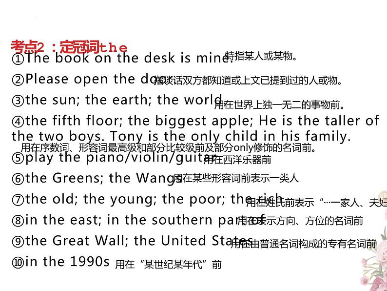 ①The bk n the desk is mine. ②Please pen the dr. ③the sun; the earth; the wrld.④the fifth flr; the biggest apple; He is the taller f the tw bys. Tny is the nly child in his family. ⑤play the pian/vilin/guitar ⑥the Greens; the Wangs ⑦the ld; the yung; the pr; the rich⑧in the east; in the suthern part f⑨the Great Wall; the United States⑩in the 1990s