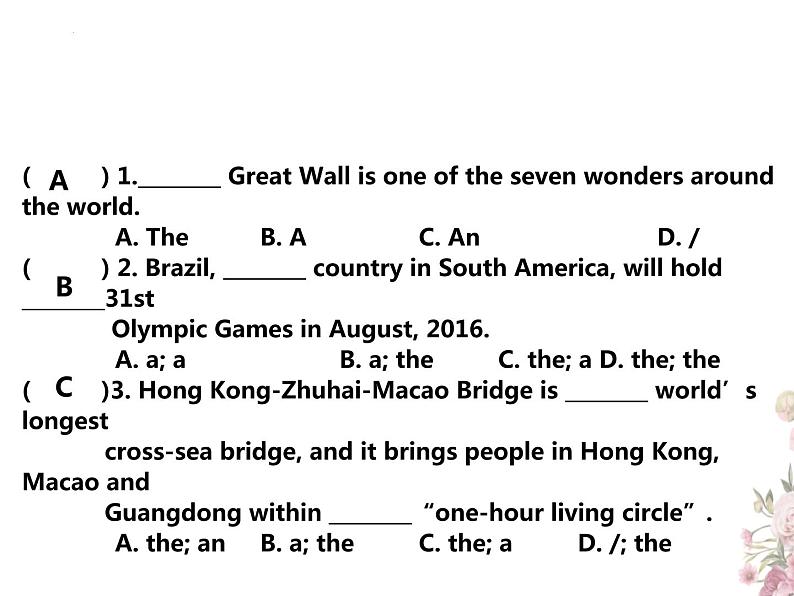 () 1.________ Great Wall is ne f the seven wnders arund the wrld. A. TheB. AC. AnD. /() 2. Brazil, ________ cuntry in Suth America, will hld ________31st Olympic Games in August, 2016. A. a; aB. a; theC. the; a D. the; the()3. Hng Kng-Zhuhai-Maca Bridge is ________ wrld’s lngest crss-sea bridge, and it brings peple in Hng Kng, Maca and Guangdng within ________“ne-hur living circle”. A. the; anB. a; theC. the; aD. /; the