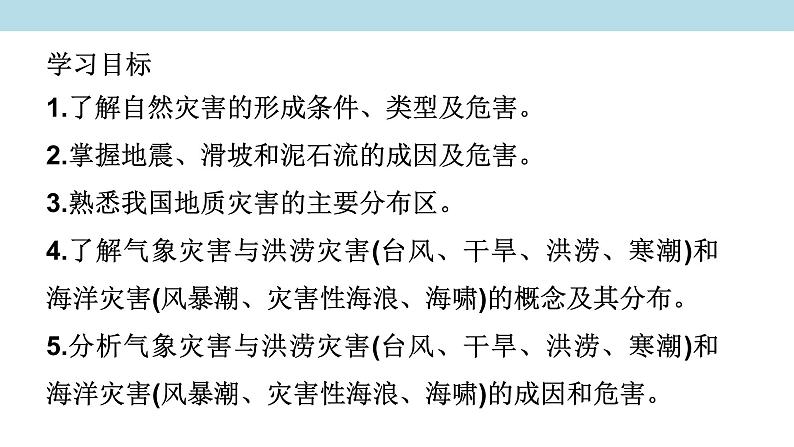 学习目标1.了解自然灾害的形成条件、类型及危害。2.掌握地震、滑坡和泥石流的成因及危害。3.熟悉我国地质灾害的主要分布区。4.了解气象灾害与洪涝灾害(台风、干旱、洪涝、寒潮)和海洋灾害(风暴潮、灾害性海浪、海啸)的概念及其分布。5.分析气象灾害与洪涝灾害(台风、干旱、洪涝、寒潮)和海洋灾害(风暴潮、灾害性海浪、海啸)的成因和危害。