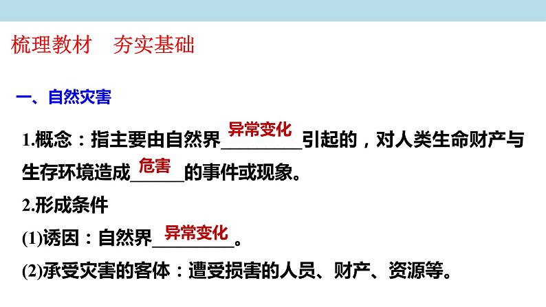 1.概念:指主要由自然界_________引起的,对人类生命财产与生存环境造成______的事件或现象。2.形成条件(1)诱因:自然界_________。(2)承受灾害的客体:遭受损害的人员、财产、资源等。
