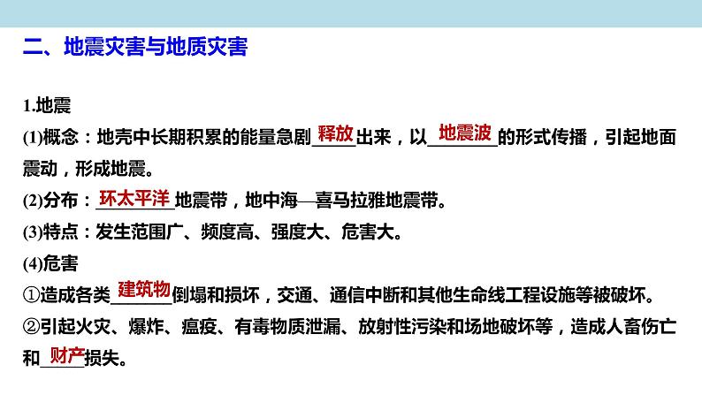 1.地震(1)概念:地壳中长期积累的能量急剧_____出来,以________的形式传播,引起地面震动,形成地震。(2)分布:_________地震带,地中海—喜马拉雅地震带。(3)特点:发生范围广、频度高、强度大、危害大。(4)危害①造成各类_______倒塌和损坏,交通、通信中断和其他生命线工程设施等被破坏。②引起火灾、爆炸、瘟疫、有毒物质泄漏、放射性污染和场地破坏等,造成人畜伤亡和_____损失。