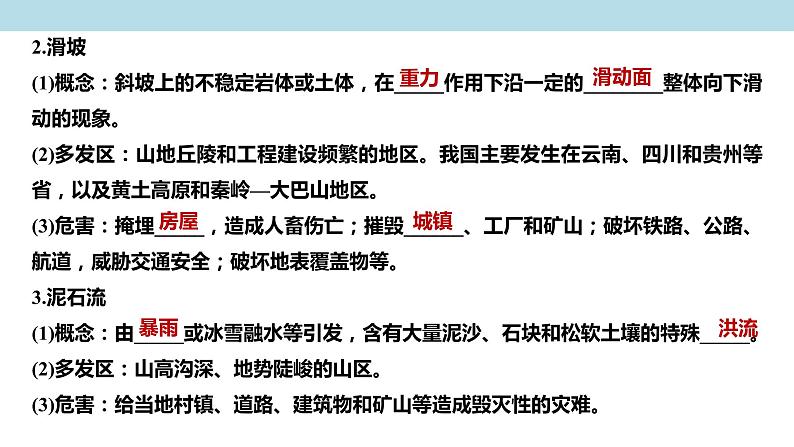 2.滑坡(1)概念:斜坡上的不稳定岩体或土体,在_____作用下沿一定的________整体向下滑动的现象。(2)多发区:山地丘陵和工程建设频繁的地区。我国主要发生在云南、四川和贵州等省,以及黄土高原和秦岭—大巴山地区。(3)危害:掩埋_____,造成人畜伤亡;摧毁______、工厂和矿山;破坏铁路、公路、航道,威胁交通安全;破坏地表覆盖物等。3.泥石流(1)概念:由_____或冰雪融水等引发,含有大量泥沙、石块和松软土壤的特殊_____。(2)多发区:山高沟深、地势陡峻的山区。(3)危害:给当地村镇、道路、建筑物和矿山等造成毁灭性的灾难。