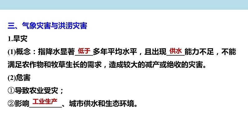 三、气象灾害与洪涝灾害1.旱灾(1)概念:指降水显著_____多年平均水平,且出现_____能力不足,不能满足农作物和牧草生长的需求,造成较大的减产或绝收的灾害。(2)危害①导致农业受灾;②影响_________、城市供水和生态环境。