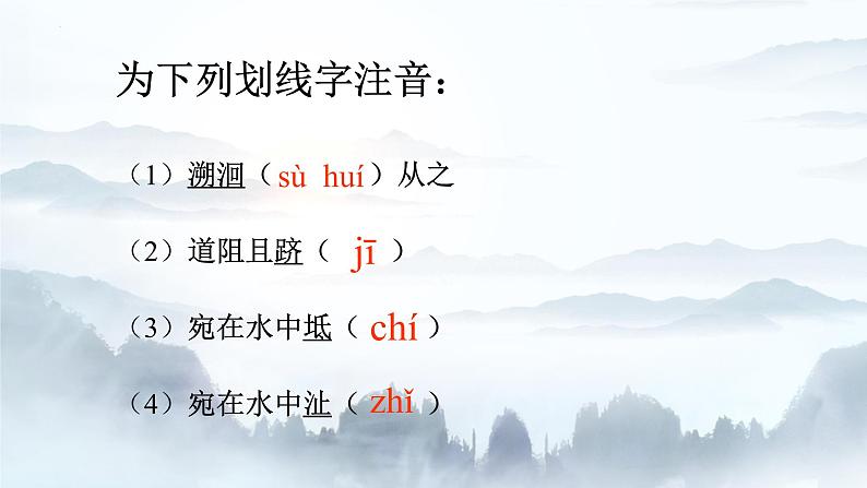 (1)溯洄( )从之(2)道阻且跻( )(3)宛在水中坻( )(4)宛在水中沚( )