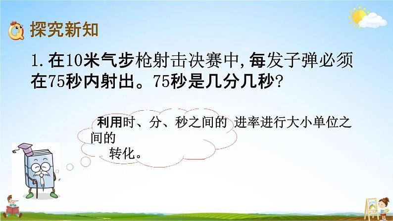 1.在10米气步枪射击决赛中,每发子弹必须 在75秒内射出。75秒是几分几秒?利用时、分、秒之间的 进率进行大小单位之间的转化。