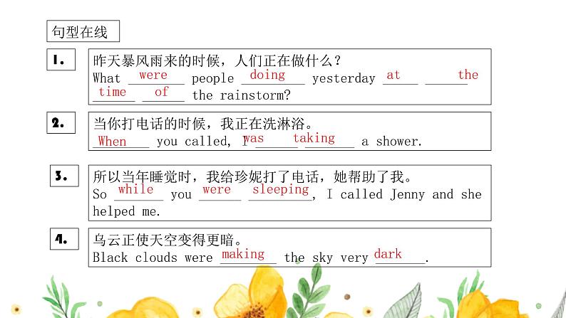 昨天暴风雨来的时候,人们正在做什么?What ________ peple _________ yesterday _____ ______ ______ ______ the rainstrm?