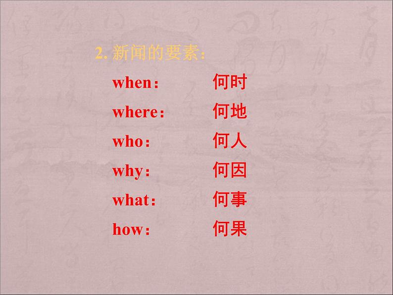2. 新闻的要素: when:何时 where:何地 wh:何人 why:何因 what:何事 hw:何果