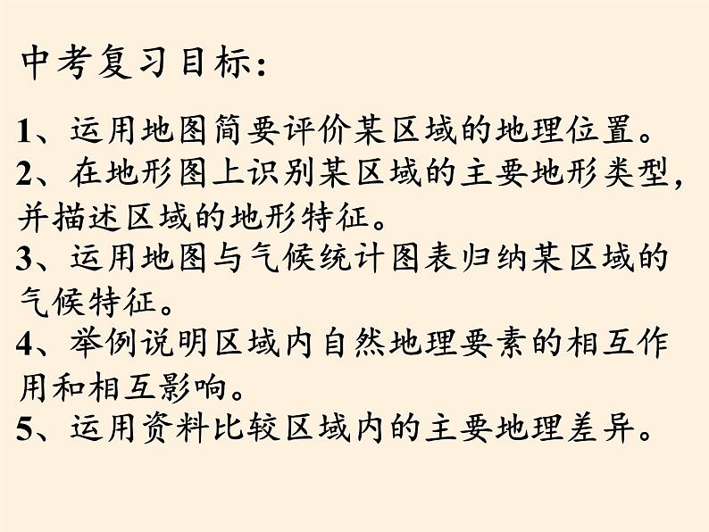 1、运用地图简要评价某区域的地理位置。2、在地形图上识别某区域的主要地形类型,并描述区域的地形特征。3、运用地图与气候统计图表归纳某区域的气候特征。4、举例说明区域内自然地理要素的相互作用和相互影响。5、运用资料比较区域内的主要地理差异。