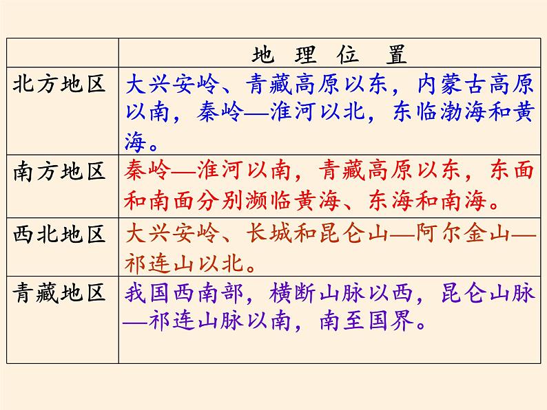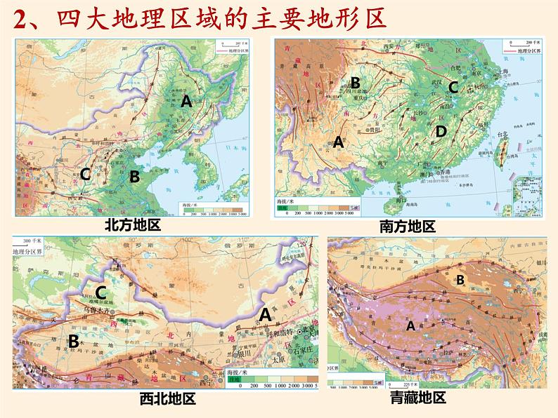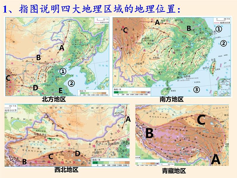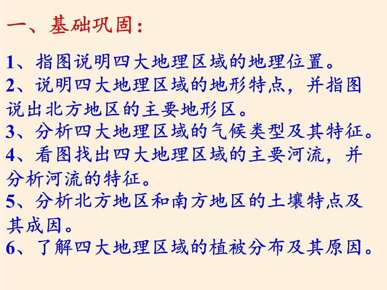 1、指图说明四大地理区域的地理位置。2、说明四大地理区域的地形特点,并指图说出北方地区的主要地形区。3、分析四大地理区域的气候类型及其特征。4、看图找出四大地理区域的主要河流,并分析河流的特征。5、分析北方地区和南方地区的土壤特点及其成因。6、了解四大地理区域的植被分布及其原因。