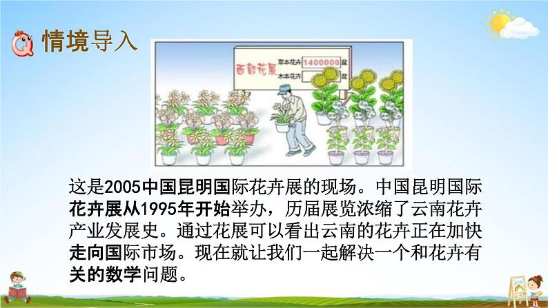 展开这是2005中国昆明国际花卉展的现场。中国昆明国际 花卉展从1995年开始举办,历届展览浓缩了云南花卉 产业发展史。通过花展可以看出云南的花卉正在加快 走向国际市场。现在就让我们一起解决一个和花卉有 关的数学问题。