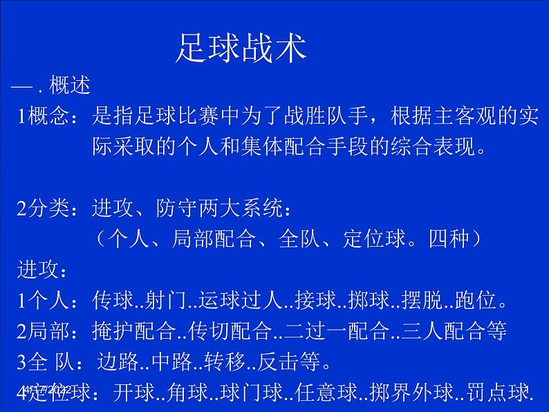 防守:1个人:盯人..选位。 2局部:临近位置配合..保护..补位。 3全队:区域..盯人..混合。 4定位球:开球..角球..球门球..任意球..掷界外球..罚点球。 3作用与意义: 技术、身体素质、心理品质和战术质量及水平紧密相关。技术和身体素质是战术基础;良好和稳定的心理素质是完成战术任务的思想保证。它们之间的作用相互渗透、相互补偿、相互制约,片面强调某一方面的作用和依赖某一方面的优势,已很难在高水平比赛中取得优异成绩。足球比赛是攻和守这对矛盾组成的,攻和守不断地变换组成了比赛的全过程。实践证明:成功地组织战术和巧妙运用战术是夺取比赛胜利的重要因素,即做到扬长避短克敌制胜。