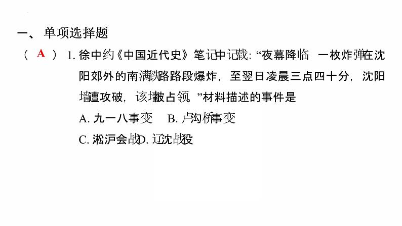 这是一份中考历史二轮复习能力提升课件:第二部分 第六单元 中华民族的抗日战争(含答案),共40页。PPT课件主要包含了能力提升,答案D,答案A,答案B等内容,欢迎下载使用。