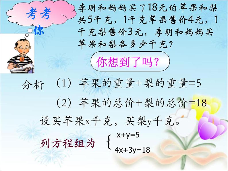 问题3:有那位同学能举出生活中运用二元一次方程组解决问题的例子。并根据题意列出方程。