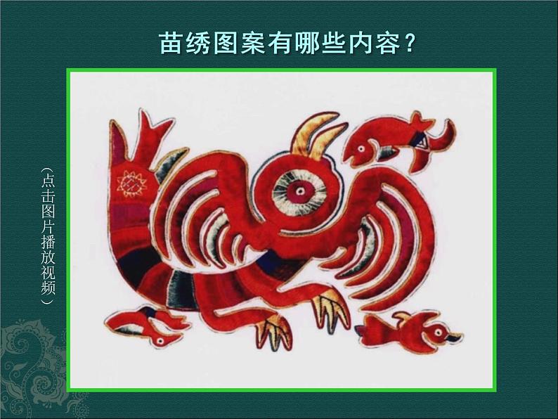 这是一份人美版六年级下册17.绣在服装上的故事教案配套课件ppt,共24页。PPT课件主要包含了贵州朗德,贵州朗德的花苗少女,苗绣图案,水波纹,山脉纹,迁徙的历史,蝴蝶纹,牛首龙,图腾崇拜,苗历新年舞蹈等内容,欢迎下载使用。