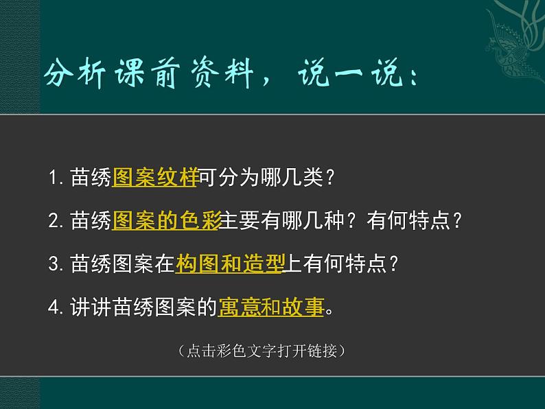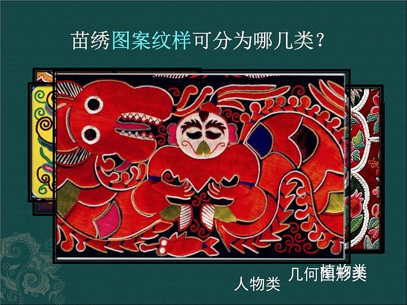1.苗绣图案纹样可分为哪几类? 2.苗绣图案的色彩主要有哪几种?有何特点? 3.苗绣图案在构图和造型上有何特点? 4.讲讲苗绣图案的寓意和故事。